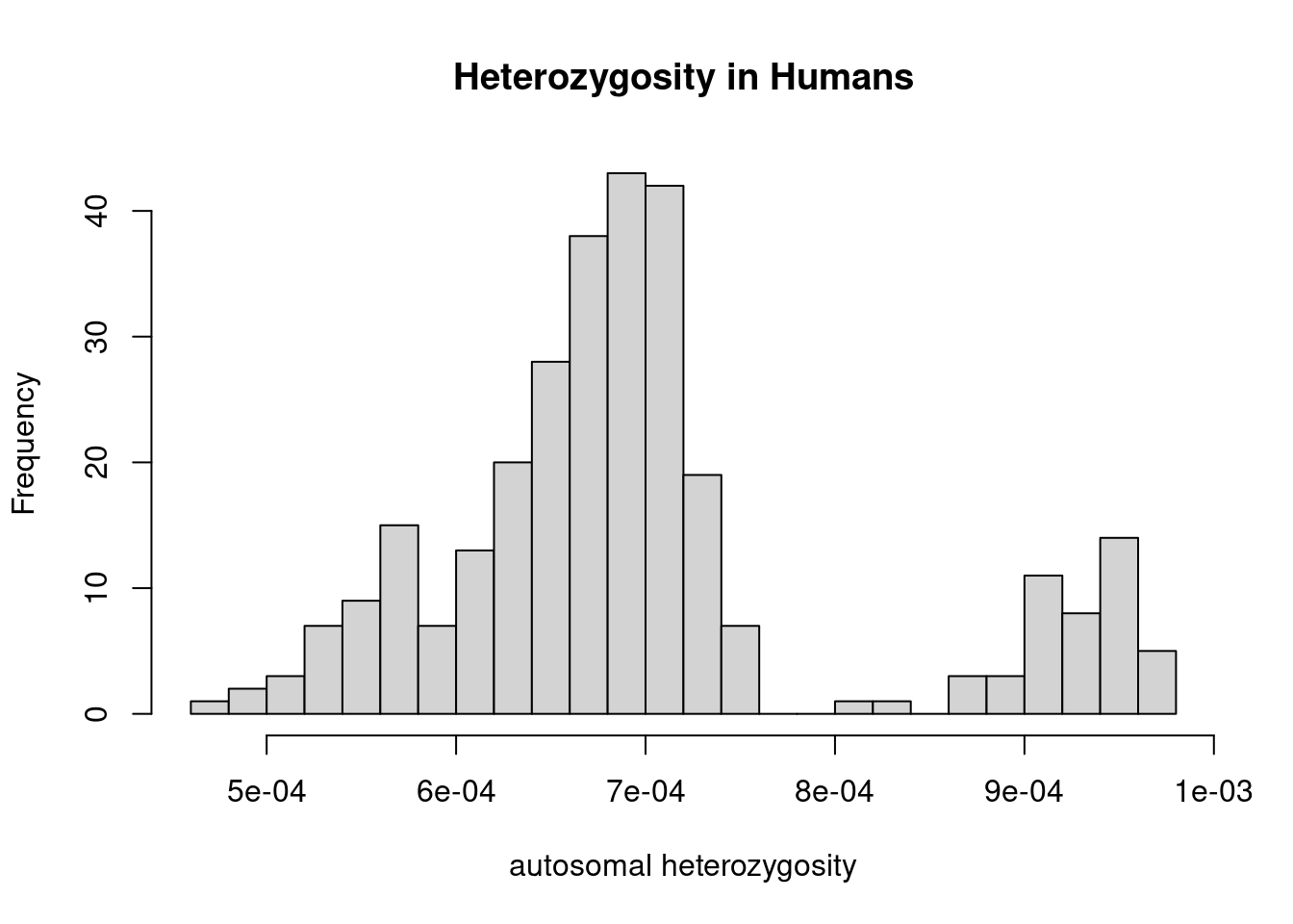 hist(dat$heterozygosity, n = 20, main="Heterozygosity in Humans", xlab="autosomal heterozygosity")