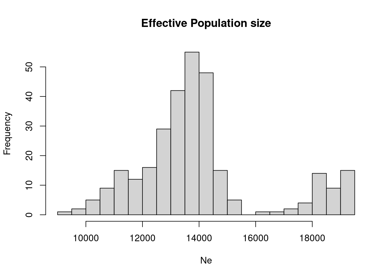 hist(dat$Ne, n = 20, main="Effective Population size", xlab="Ne")