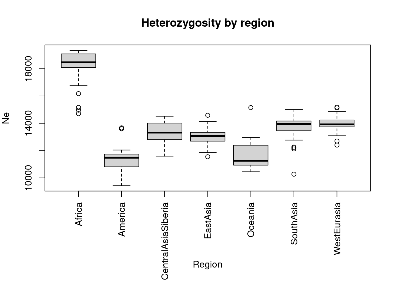 ret <- boxplot(Ne ~ region, data = dat, xaxt = "n", xlab = "", main = "Heterozygosity by region")