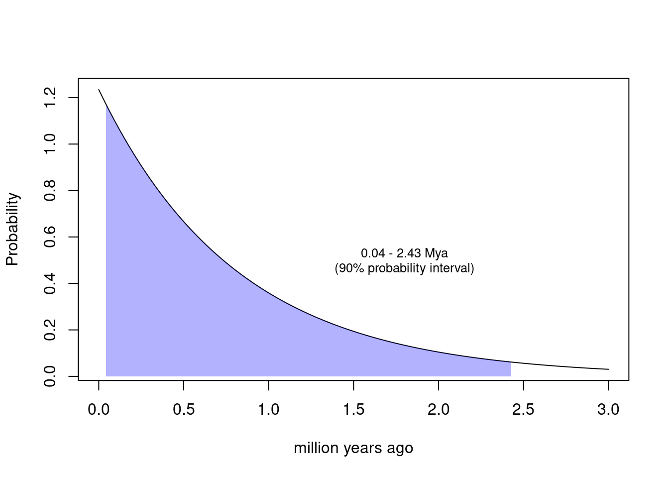 text(1.8, 0.5, labels = sprintf("%.2f - %.2f Mya\n(90%% probability interval)",